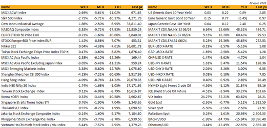 US markets fell to its lowest points in more than month as fears of a more aggressive Fed tightening soured sentiment. 10-year UST yields are higher by 7 bps for the week, with the 2 years up some 24 bps. The Nasdaq took the brunt of the fall, declining 3.83% for the week.