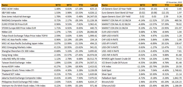 China’s lockdowns have triggered civil unrest in multiple cities, representing visible public dissent against Xi Jinping since he came to power in 2012. The Chinese Government is yet to publicly respond but there are fears the protests may turn violent and prompt a crackdown by authorities. Situation adds another layer of uncertainty to China’s expected reopening with some thought it might encourage a faster reopening. Goldman however seems to think this may trigger a faster reopening, time shall reveal.