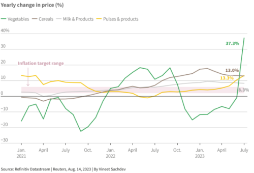 In India, the annual retail inflation was at a 15-month high of 7.44% in July, food price inflation rose to 11.5%, its highest in more than 3 1/2 years. While government actions (inventory management, imports) are likely to be the first line of defence to manage food prices, higher food—and therefore headline—inflation is likely to keep the RBI cautious.