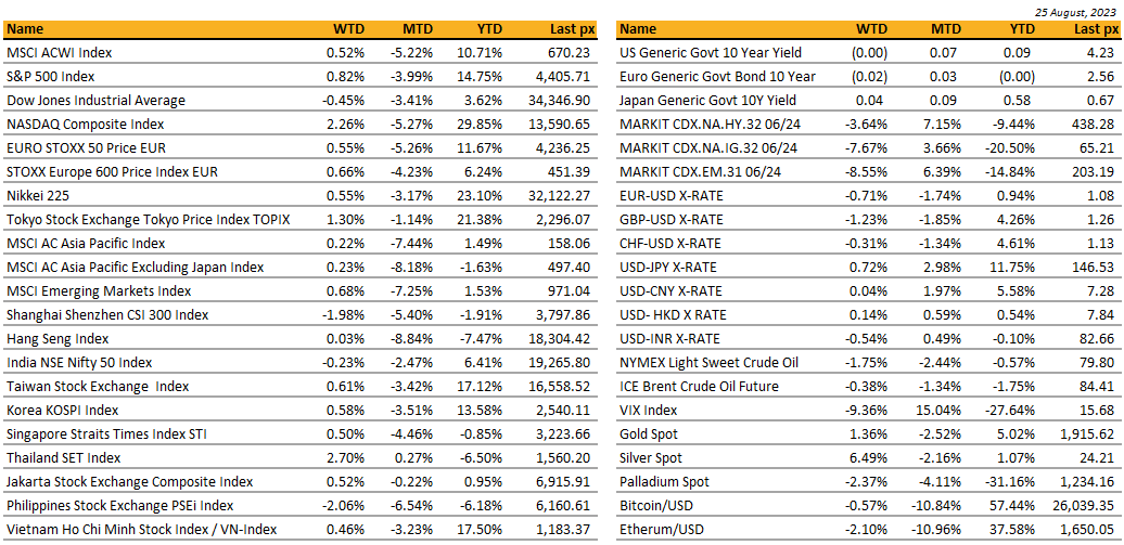 After 3 brutal weeks of continued selloff, US stocks staged a first winning week since July as markets digest Chair Powell’s remarks from the Jackson Hole symposium on Friday. Powell suggested policy could remain tighter for longer and will “proceed carefully” on whether to raise rates again. Whilst welcoming the slower pace of gains in the US economy, he cautioned that the process still has a long way to go, to get inflation down to 2%. His comments are consistent with expectations that the Fed will leave rates unchanged at the Sept. 19-20 meeting, with the possibility of a hike later in the year and then, a pause. No hints just yet of a peak which indicate no cuts on the table for now. Members of the Fed are less unanimous with a couple of dissenters that think policymakers have likely undertaken sufficient tightening. UST10Y yields retreated from its highs after readings earlier showed US services and manufacturing businesses dropped to a 6-month lows. Post Powell’s speech, 10’s closed at 4.235% and widened against the 2’s at 5.08%. The USD was pretty much unchanged on the week against major currencies.