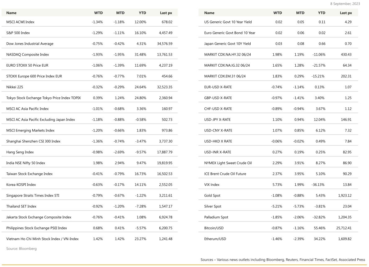 US markets fell for the shortened week after a 2-week upstreak as good news spelt bad news, that a strong US economy will prompt the Fed to keep rates higher for longer. Bond traders have been ratcheting up bets that the Federal Reserve isn’t done with its interest-rate hikes just yet. With the economy defying gloomy forecasts and energy prices rising, economists are forecasting the biggest monthly jump in 14 months — and the swaps market is pricing in risk that it will come in even higher than expected. Brent oil climbed above $90 a barrel – a 9-month high and was on track for a small weekly gain after supply curbs from OPEC+ leaders Saudi Arabia and Russia were extended for the rest of the year. Growing tensions between US and China added to the risk off sentiment with China banning the use of Apple’s i-phones in government and state owned businesses and the US probing a made in China chip housed within Huawei’s latest smartphone.