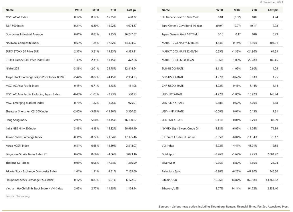 US markets eked out a gain for the week, with the S&P 500 advancing for a sixth week to end at the highest level since March 2022. The trigger for the rally boosted optimism that the Fed Reserve can rein in inflation without causing a recession. Robust labour market data released Friday, although pushing yields higher, underlined the resilience of the economy. This was affirmed by the U. of Michigan’s consumer sentiment index which rebounded sharply to 69.4 from 61.3 in November. Recent forward inflation was rebounding but the preliminary data for December released last Friday saw a significant dropped in forward inflation with the 1-year inflation expectations fell to 3.1% from 4.5% whilst the 5-10 year expectations fell to 2.8% from 3.2% – both much lower than expectations. Odds continue to favour a no-change expectation at this week’s FOMC meeting. 10 year Treasuries closed at 4.22% whilst the 2’s closed at 4.72. The VIX closed at 12.35 its lowest since January 2022.