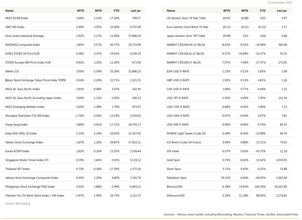 Asia markets closed the week higher MSCI Asia ex Japan was up 3%! Risk sentiment improved as the week wore on after the US Fed signalled as many as three rate cuts next year. China’s CSI 300 however continued its pullback, down 1.7%, taking YTD numbers to -13.24% as worries of the health of the Chinese economy dragged sentiments. Chinese economic data had tilted to the downside with November’s retail sales missing forecasts, adding to a deflationary headline CPI, and, while industrial output data was encouraging, construction and property investment was weakened. House prices in November also fell again on a m/m basis. China credit data came softer than expected with slower M1 growth furthered widening the gap vs M2. To support the economy, the PBOC injected a record amount of cash into the financial system Friday, helping property stocks to surge and send the Hang Seng significantly higher.