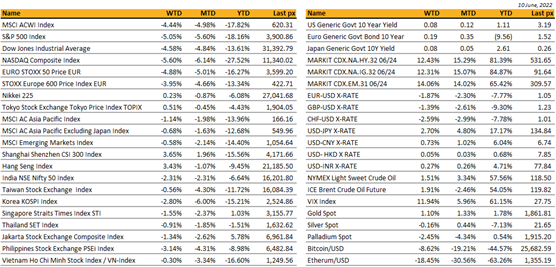 US markets slid for a third straight session ending the week down 6.6%, 5.6% and 7.9% for the S&P 500, Dow and Nasdaq Composite respectively. Hotter than expected US CPI data boosted bets that the Fed Reserve will remain aggressive in its rate hike path. The US Treasury yield flattened further, with 2 years at 3.06% and the 30’s at 3.19% pointing to a faster pace of Fed tightening. Headline CPI rose to 8.6% a new 40-year high, month on month rose by 1%, both above expectations. Only the yearly core CPI excluding food & energy fell slightly to 6% whilst the monthly data came in unchanged at 0.6% both, again above expectations.