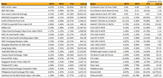 Asian markets followed the tune to the global market pull back. Fears of further rate hikes from the US Fed after a higher-than-expected US inflation print in August weighed on investor sentiment globally. China CSI 300 led losses, down 3.94% for the week. Hang Seng was lower by 3.1%. Singapore was the only market in Asia to buck the fall holding flat at +0.16%.