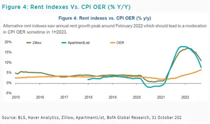 For shelter costs, the calculation of owners’ equivalent rent (OER), which is one of the key measures of how CPI incorporates rental costs, is by nature, lagging, and more incidental housing data, such as those on Zillow and Apartment List, have seen a significant drop (Figure 4). All these are likely to take pressure off core inflation in the coming quarters too and certainly headed in the direction the Fed needs it to head in.