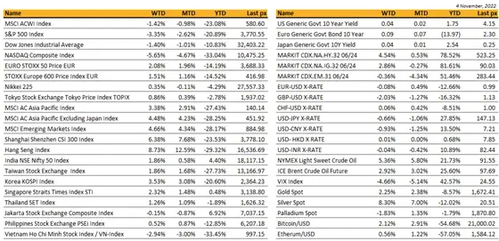 Only two countries in Asia are in the green for the year as of YTD October close. India (+2.49%) and Indonesia (+7.21%). The first trading week of November started out with much promise of a possible rebound, led by China (+ 6.38%) and HK (+ 8.73%) on the back of rumors of reopening and a myriad of possibly FOMO trades by investors. MSCI Asia ex Japan closed the week at +4.48%.
