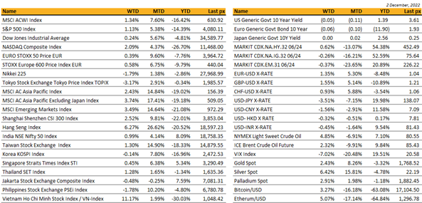 Meanwhile, economic data released remain mixed – US economic growth was revised higher Q3 GDP at 2.9%, core PCE declined to 5%, manufacturing contracted in November for the first time since May 2020 whilst Friday’s stronger than expected jobs data cast a shadow over continued optimism in risk assets. 263k jobs were added, the unemployment rate remained at 3.7% whilst participation rate fell to 62.1%. The wages component of the report held firm which (unfortunately) is not exactly welcoming news for a Fed hell-bent on pushing unemployment to what it calls restrictive territory circa 4.4%. Powell had cautioned earlier in the week that slacker job-market conditions were needed to cool a 40-year high inflation.