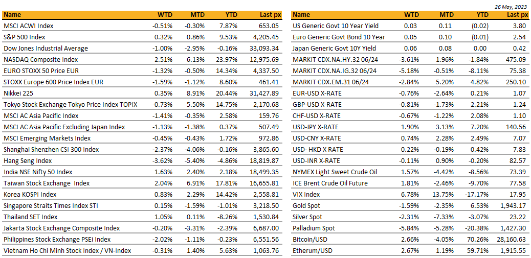 Bloomberg Commodity Index fell 0.98%, as Gold weakens by 1.59% to 1946.6 due to higher US yields and broad-based USD strength. A tentative debt ceiling deal further added to better risk sentiment, which weakens Gold as a safe haven commodity. WTI and Brent rose 1.57% and 1.81% respectively, after Saudi Arabia issued a warning to short-sellers, suggesting OPEC+ might reduce output to buoy prices. Concerns on China recovery remains as base metal continues to fall. Aluminium, Copper and Iron Ore all fell, with Iron Ore the bigger loser at -6.8%.