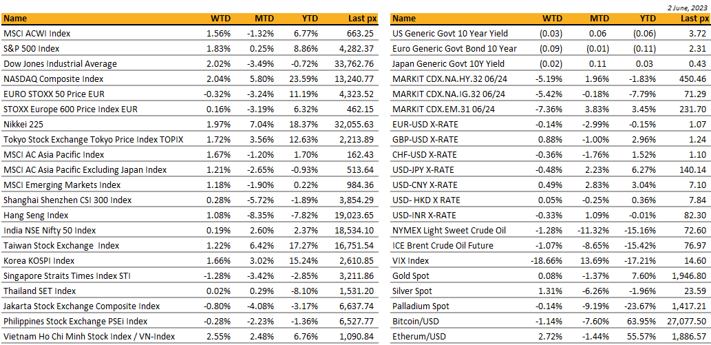 DXY USD fell 0.18% to 104.015 despite the Senate approving a measure to suspend debt ceiling limit through January 1, 2025, as more Fedspeak suggested the FOMC may pause its tightening cycle in June. In the US, we have a large upside surprise in May non-farm payrolls, although underlying details of the jobs report were mixed. Non-farm payrolls increased by 339k (C: 195k; P: 294k), with upward revisions of +93k across March and April. However, employment in the household survey fell by 310k and pushed the Unemployment Rate up to 3.65% (C: 3.5%; P: 3.39%). ISM Manufacturing PMI came in at 46.9 in May (C: 47.0; P: 47.1). Prices Paid fell sharply to 44.2 (C: 52.3; P: 53.2), its lowest level since January 2023.