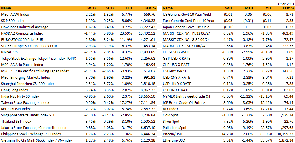 DXY USD Index rose 0.65% to 102.09, as weak global preliminary PMIs for June (forewarning more headwinds to global growth) led to broad-based USD strength. In prepared testimony, Fed Chair Powell communicated a message consistent with the June FOMC meeting. Powell reiterated that the decision to hold rates steady was driven by progress made in monetary tightening, with the uncertain lags with which monetary policy affects the economy, and potential headwinds from credit tightening. Powell noted nearly all FOMC participants expect to raise rates further by the end of the year, likely two more rate hikes. However, FOMC will make “decisions meeting by meeting, based on the totality of incoming data and their implications for the outlook for economic activity and inflation, as well as the balance of risks”. Data wise, US Composite PMI signalled the slowest pace of output since March at 53.0 (C: 53.5; P: 54.3). Manufacturing weighed on the overall expansion while robust growth continued in the services sector. Manufacturing PMI fell to 46.3 (C: 48.5; P: 48.4) as manufacturers recorded the fastest rate of contraction in new orders since December, with weak demand linked to muted customer confidence. The Services PMI fell to 54.1 (C: 54.0; P: 54.9), but demand conditions remained robust, with strong customer confidence and new client acquisition.