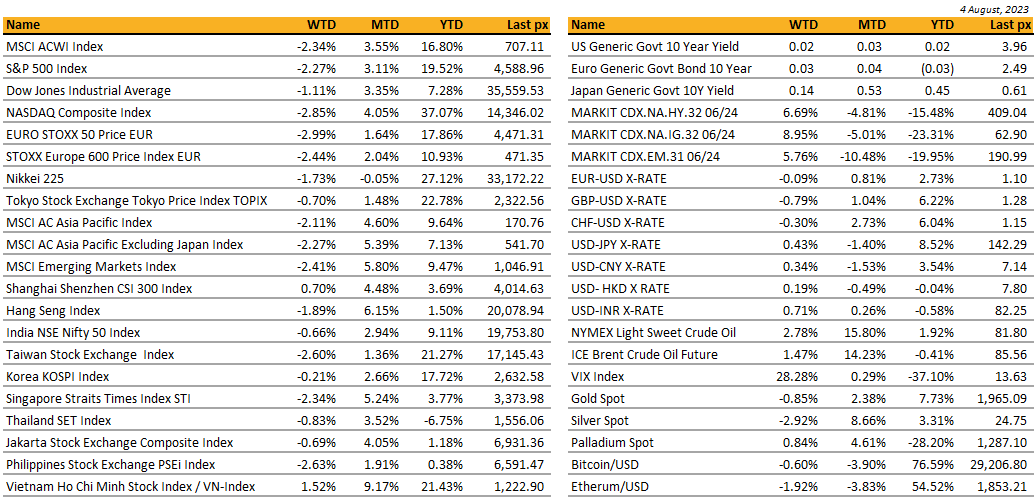 DXY USD Index rose 0.39% to 102.02, as Fitch downgrade of the US long-term credit ratings to AA+ from AAA invokes concerns across risk markets. Data wise, Non-farm payrolls came in below expectation at 187k (C: 200K), while unemployment rate came in lower at 3.5% (C: 3.6%). Average hourly earnings came in at 0.4% mom, above consensus. ISM manufacturing came in at 4.4, below consensus, while ISM prices paid were below expectation as well.