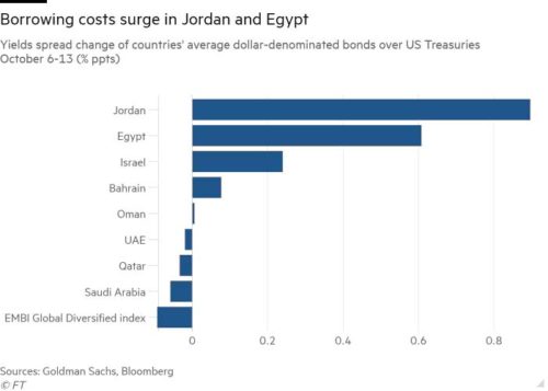 The war between Israel and Hamas is heaping pressure on borrowing costs in neighbouring countries, as international investors grow increasingly concerned that the conflict will rapidly escalate. The spreads — or gaps — between the average yields on both Jordan’s and Egypt’s dollardenominated bonds and equivalent US Treasuries have shot up this week as investors have priced in more risk for owning the debt. Since October 6, the yield on Jordan’s 2030 dollar-denominated bond has jumped from 8.5 per cent to 9.45 per cent, the highest level since October last year. Yields move inversely to prices.