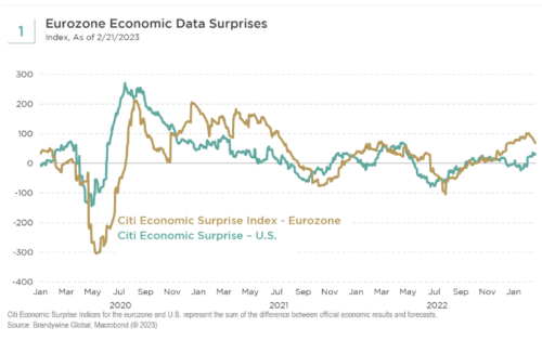 Firstly, the assumption that Europe’s dependency on cheap Russian energy would push the economy into a deep recession – it certainly did not happen as forecasters had not counted on the aggressive European response. In fact, looking at the EU Economic Data Surprises chart 1 below, euro area economy is in expansion territory with a last reading at 52.3. Amazingly, surpassing that of the US!