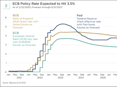 Is it too early to call a peak in European rates? The below chart 2 seems to indicate the ECB could be close to the end of of its tightening cycle based off market expectations.