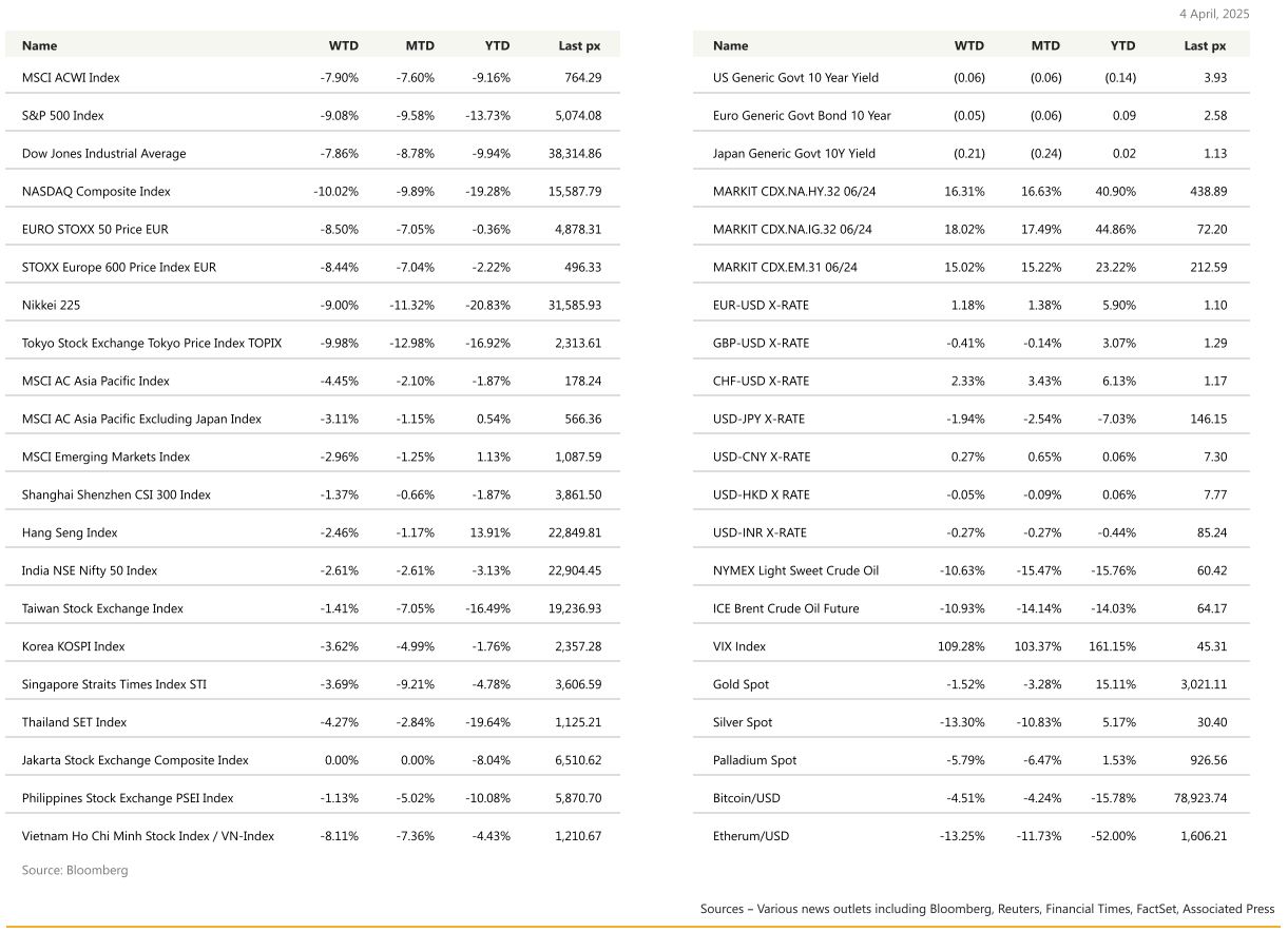 President Trump announced a 10% baseline tariff effective April 5 with additional reciprocal tariffs on select countries effective April 9 in addition to incremental tariffs on a country-by-country basis. In response, China imposed a 34% tariff on US imports, matching US reciprocal tariffs. In addition, Fed Chair Powell emphasizing patience and push back against immediate rate cut bets. US macro data was mixed: Strong US employment data with the March nonfarm payrolls rising 228k (C: 140k). The Unemployment Rate edged up to 4.15% (P: 4.14%) alongside a rise in the labor force participation rate Average Hourly Earnings grew 0.3% m/m (C: 0.3%; P: 0.3%). ISM services Index dropped to 50.8 in March (C: 52.9; P: 53.5) with the employment index unexpectedly falling 7.7 points to 46.2, the largest decline in nearly five years. US ISM Manufacturing declined to 49.0 (C: 49.5; P: 50.9) with the new orders and employment indices falling further into contraction, while the prices paid index rises further, reaching the highest level since June 2022. Market is currently pricing 109 bps cut in the US this year.