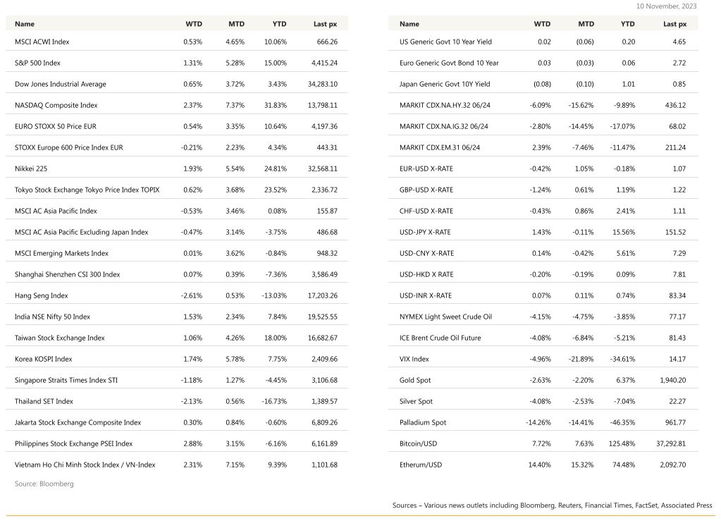 Performance on the major indices in Asia were mixed last week, with Hang Seng Index (-2.61%) the worst performing market, driven by the negative China trade and inflation number. Despite this, China CSI (+0.07%) closed the week relatively flat. Japan Nikkei 225 (+1.93%) and Topix (+0.62%) rose for the week. Korea KOSPI index rose 1.74%, as FSC announced a short-selling ban on domestically listed stocks until June 2024, while Taiwan Index rose 1.06%. Within ASEAN, Philippines and Vietnam both rose more than 2%, while Thailand and Singapore Index fell 2.13% and 1.18% respectively.