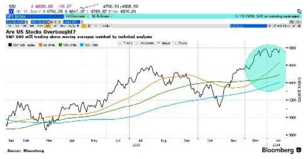 Helping with sentiment was also news that Congress passed a continuing resolution to fund the government, at least until March, which prevented a government shutdown. The S&P 500 Index finally finished at an all-time high for the first time in two years on Friday, marking a crucial milestone in the resurgence of the US stock market. Markets started the shortened week on its back foot initially following Fed-speak that pushed back the consensus’ view of a March rate cut. Federal Reserve Governor Christopher Waller said the US central bank should take a cautious and systematic approach when it begins cutting interest rates. His comments pushed yields higher, with the UST10’s and 2’s at 4.12% and 4.38% respectively. Atlanta’s Bostic said he was open to earlier cuts on faster drop in inflation but would be comfortable to do so only in Q3. Technical traders are starting to question if.…..US stocks are overbought?