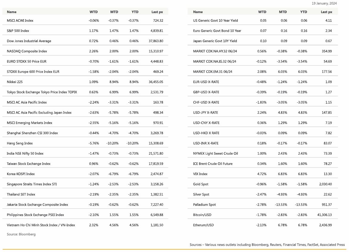 Asian markets continued its downtrend last week, MSCI Asia ex Japan was lower by 2.63%. Hang Seng index led the declines, down 5.76% for the week and 10.2% for the month. Hang Seng logged third straight weekly losses, the worst start of a year since 2016. Japan, Taiwan and Vietnam bucked the downtrend, closing higher last week. Japanese shares were lifted by chip-industry stocks after Taiwan Semiconductor Manufacturing projected 2024 revenue growth of over 20%.