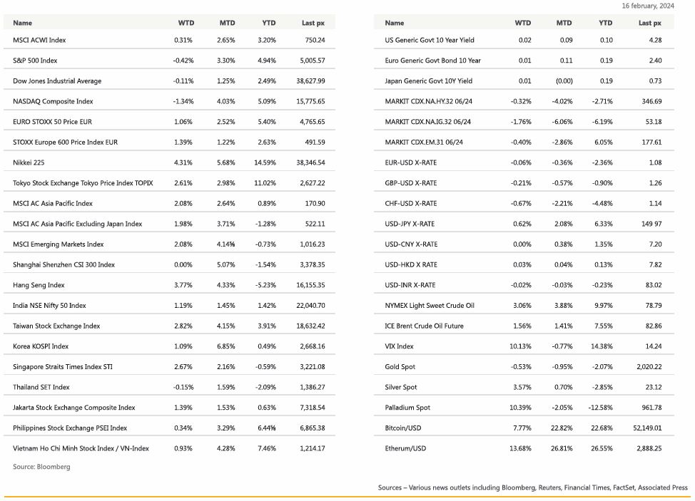 DXY USD Index rose 0.16% to 104.27 driven by US CPI and PPI. Headline CPI result come in at 0.3% mom (vs 0.2% expected), with the yoy value at 3.1% (vs 2.9% expected). Core CPI, which excludes food and energy prices, rose 0.4% mom (vs 0.3% expected), its highest value since last May. This brought the core CPI up to 3.9% yoy (vs 3.7% expected), reducing the already slim chances that the Fed will be lowering rates in the near-term. January PPI data pointed to an acceleration in all PCE inputs: domestic air transportation; acceleration in health services; financial services and insurance. However, headline US retail sales missed to the downside, falling -0.8% mom (vs -0.2% expected), and with the December reading revised down from 0.6% to 0.4%. This is the weakest report since last March and showed a broad-based cooling with nine of the 13 spending categories declining.