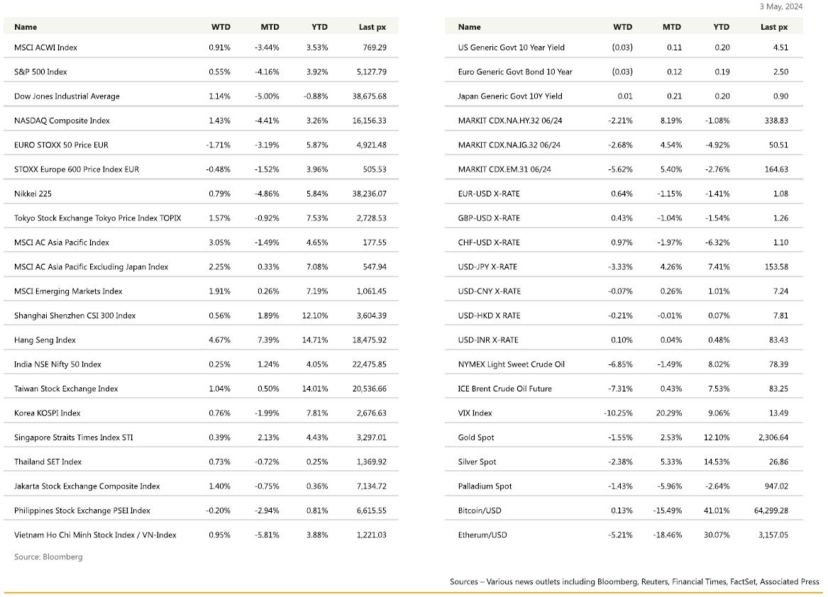 Friday sealed the fortunes for the week as US markets ended up for a second straight week of gains. April’s jobs data showed some cooling boosting confidence that the Fed will be able to start cutting rates, this year. Nonfarm payrolls advanced 175,000 last month below expectations of +240k, the smallest gain in six months, a Bureau of Labor Statistics report showed Friday. The unemployment rate ticked up to 3.9% and wage gains slowed. Powell, who spoke Wednesday after the central bank held interest rates steady for a sixth straight meeting, noted that wage growth probably needs to “move down incrementally” for policymakers to meet their inflation objective. Friday’s report showed some movement in that direction. Average hourly earnings climbed 0.2% from March and 3.9% from a year ago, the slowest pace since June 2021. Treasury yields and the dollar fell, with the UST10’s closing at 4.5077% and the 2’s retreating to 4.8160%. Investors returned chances of a rate cut in September to above 50%. The Fed also said it would start slowing the pace of unwinding its balance sheet in June. Overall, a slightly less hawkish tilt was what we got from his presser. Fed-speak after the number included Chicago President Austan Goolsbee saying that more employment prints like Friday’s would give him comfort the economy is not overheating, while Governor Michelle Bowman separately expressed concerns about sticky inflation but said sustained elevated rates should cool price pressures down the line. The FOMC meeting earlier in the week unanimously voted for no-change with Powell calming some nerves when he said that it was unlikely for the Committee to raise rates next although he did signal fresh concerns about inflation which is likely for the Fed to keep borrowing costs elevated for longer. Irrespective of any cuts this year, sentiment turned positive on the basis that inflation does not heat up and the economy holds up reasonably well. Earlier in the week we saw the JOLTS job openings lower than expected together with a fall in ISM Manufacturing. The more volatile weekly claim both came in lower than expected.