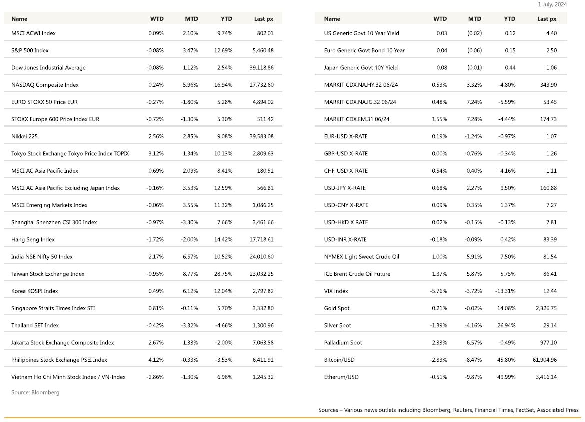 What a week that was, from a rollercoaster ride in markets to a somewhat one-sided Presidential debate which pushed US markets to end the last week of the quarter down marginally. The Nasdaq however, eked out a small gain for the week coming in at +0.26%. The latest string of inflation data in PCE came in on the nose which decelerated last month, supporting optimism for interest rate cuts later this year. The core PCE MoM increased 0.1% from April which was the smallest increase in six months and the YoY was at 2.6% which was the least since early 2021.