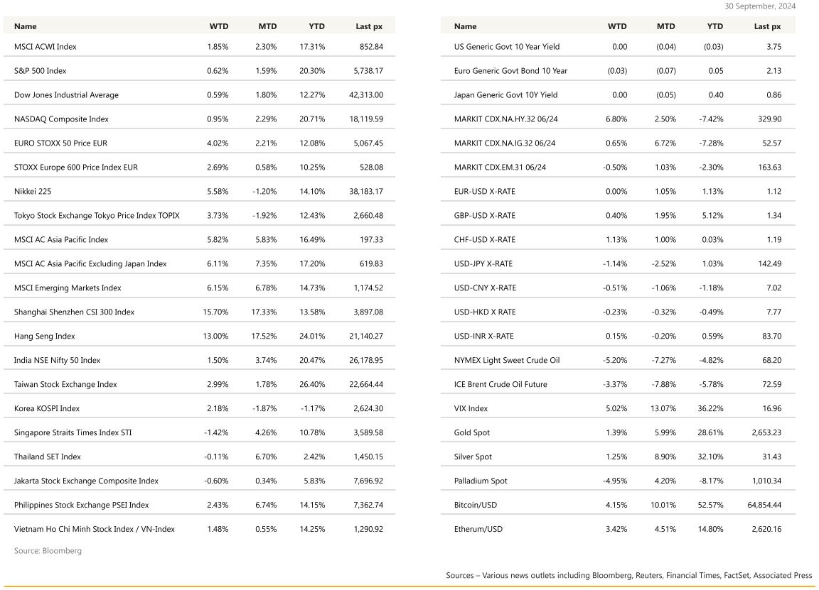 We saw yet another up week for US stocks, making it a 3- week consecutive gain, mainly on optimism the Fed Reserve will proceed with further rate cuts. September, which has been traditionally a negative month has held up well with the S&P 500 stretching ytd gains to 20%. Markets also enjoyed a fresh burst of optimism as policymakers globally move to support economic growth. Core MoM PCE came in lower than expected at 0.1% as did headline PCE YoY at 2.2%, within a whisker of the Fed’s target of 2%. Personal income & spending also came in lower than expected at 0.2% each, underscoring the Fed’s view that inflation is indeed under control. We also saw the U. of Mich. Inflation expectations for 1 Yr and 5-10 Yr coming in at a tame 2.7% and3.1% respectively. “Inflation is no longer the story in the PCE data for the Fed. » It’s now all about spending and keeping the economy strong,” said one manager. The data does suggest another 50 bps reduction in November is possible. What we are facing today is a rate-cut cycle when no recession takes place, which is positive for risk assets and investors are now of the view that the Fed and indeed, Chinese officials’ policies are sufficient enough to lift growth, said Bank of America Corp.