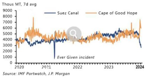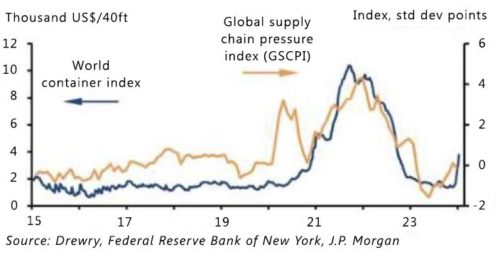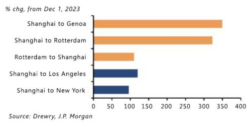 Analysts at JP Morgan project an estimated 0.7% point addition to global goods inflation (0.3% points to core inflation) in the first half of 2024 if the recent spike in shipping costs persists. Europe is anticipated to be particularly vulnerable due to its reliance on imports from Asia.