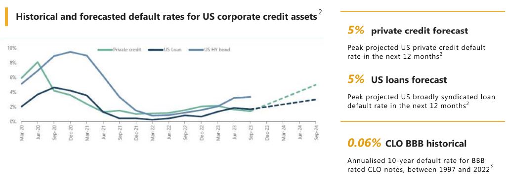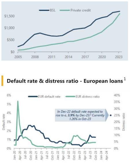 Sometime, a white knight in his shiny armour, can come to the rescue, at least temporarily. We witnessed that during the second half of last year when the saviour of the day, the Private Credit Market, helped Finastra & Hyland Software avoid possible defaults, refinancing both their loans which represented more than $8bn, loans that were maturing soon and which could not find even the “bravest” CLO managers to jump in (i.e. Finastra loan, rated CCC+, was trading in the mid-80’s in the Broad Syndicated Loan (BSL) market, before being taken private). These deals are significant for a number of reasons. First, it is the largest institutional repayment via private capital in history. Second, it shows that private lenders are willing to lend to companies with weaker credit profiles, even in a rising interest rate environment. The implications for the CLO (Collateralized Loan Obligations) market are also significant. As more companies refinance their debt with private lenders, CLOs will receive cash payments from the borrowers. This could lead to increased prepayment rates (early calls) in the CLO market, as CLOs which are close or beyond their reinvestment periods, use the cash to pay-down CLO liabilities. For CLOs still within their reinvestment period, this type of prepayments reduces overall risk in the portfolios and allow the CLO manager to acquire new assets, in the Finastra case, building par and increasing the average spread. The Private Credit Market, which size has grown exponentially over the last 3years (see chart below) has helped the BSL default rate to remain much lower than what was initially anticipated 12Months earlier (see chart 1). But, by saving companies that the economic existence is “questionable”, forecasted default rate of private credit should, overtime, be much higher than in the BSL market (see chart 2), and might negatively impact returns moving forward. The fact that loans in the Private Credit Market are usually on smaller companies, often unrated, illiquid and/or with some very limited secondary market, using valuations based on Marked-to-model, all these elements does not bode well in term of transparency for investors exposed to this asset class.