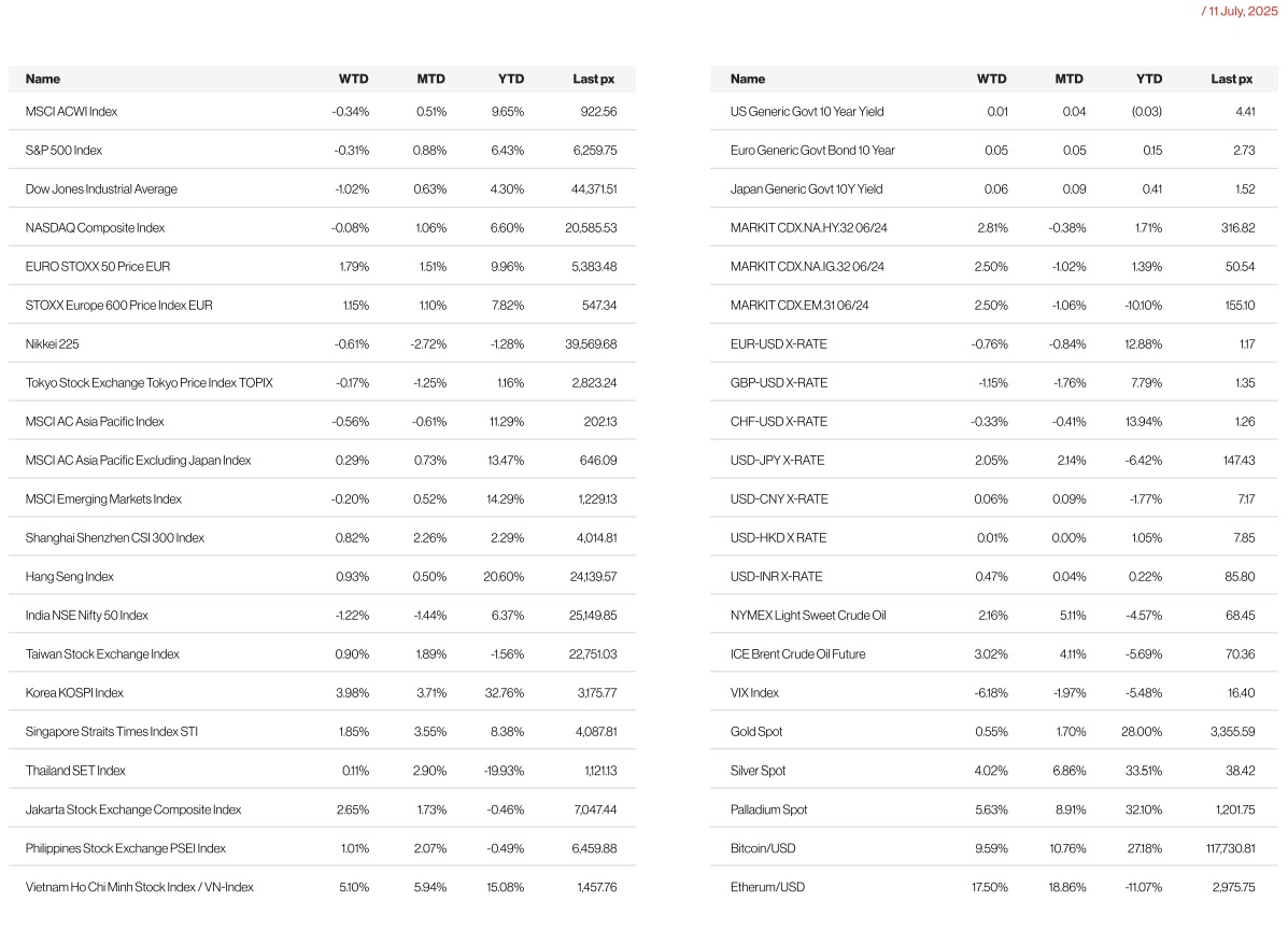 US markets ended the week slightly down as tariff headlines and new tariff threats on US’ trading partners dampened sentiment, with some calling it a tariff triggered profit taking. Trump sent letters to several countries which included a 25% tariff on goods from South Korea and Japan, and 35% on some Canadian goods. Trump had also threatened a 50% tariff on Brazil over its domestic political affairs. President Trump also said that he would impose a 50% tariff on copper imports. And, over the weekend, President Trump declared a 30% rate for the EU and Mexico effective August 1st vowing no more extensions. Trump did however, leave an opening for additional adjustments where conditions and clauses could still get these rates reduced.