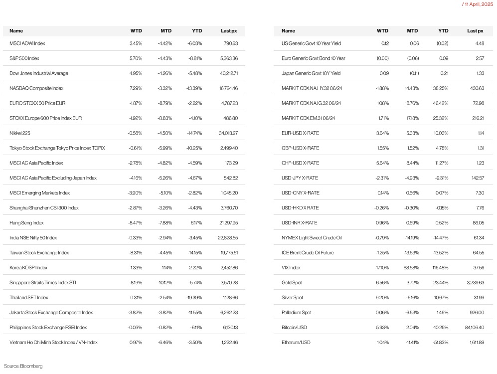 The week started on turmoil as Trump stood firm over his tariffs despite fears of a recession and even threatened an additional 50% tariff on China. On Monday, Hong Kong’s Hang Seng index plunged 13.2 per cent in its worst day in nearly three decades. Taipei stocks suffered their worst fall on record, tanking 9.7 per cent, while Tokyo closed lower by almost 8 per cent. However, things took a turn on Wednesday evening when Trump announced sudden reversal on tariffs lowering most to 10% but hiking China’s to 125%, then clarifying as 145% and only to declare later on Friday, that the tariffs excluded smartphones, computers and other electronics from the increased import duties, narrowing the scope of his tariffs on goods from China and a baseline 10% on imports from most other countries. MSCI Asia Ex Japan corrected lower by 4.16% while Hang Seng took the worst hit, falling 8.47% for the week.