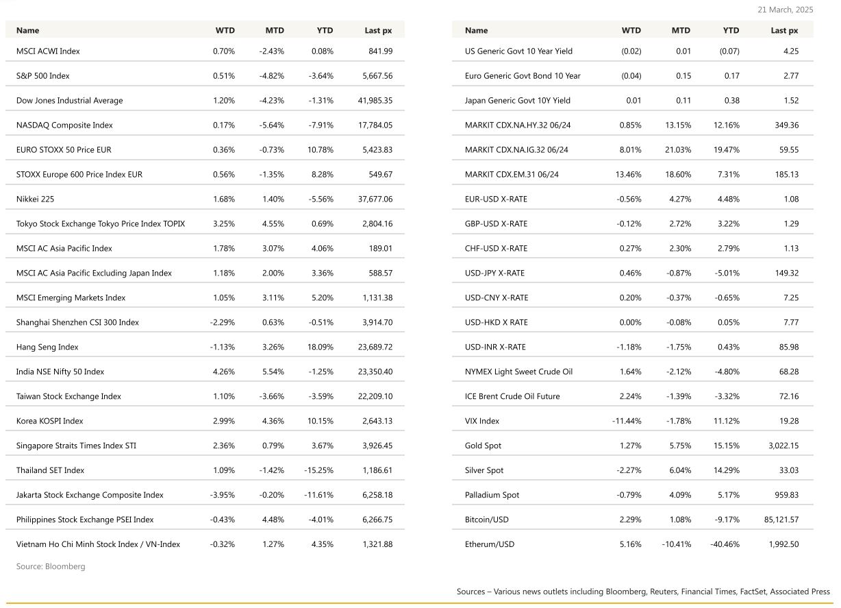 US unemployment benefits were little changed showing as stillhealthy US labour market although the full brunt of DOGE cuts is still yet to be seen. Sales of previously owned homes unexpectedly bounced back in February lifting sentiment. UST yields fell for the week to 4.246% and 3.948% for the 10’s and 2’s respectively.