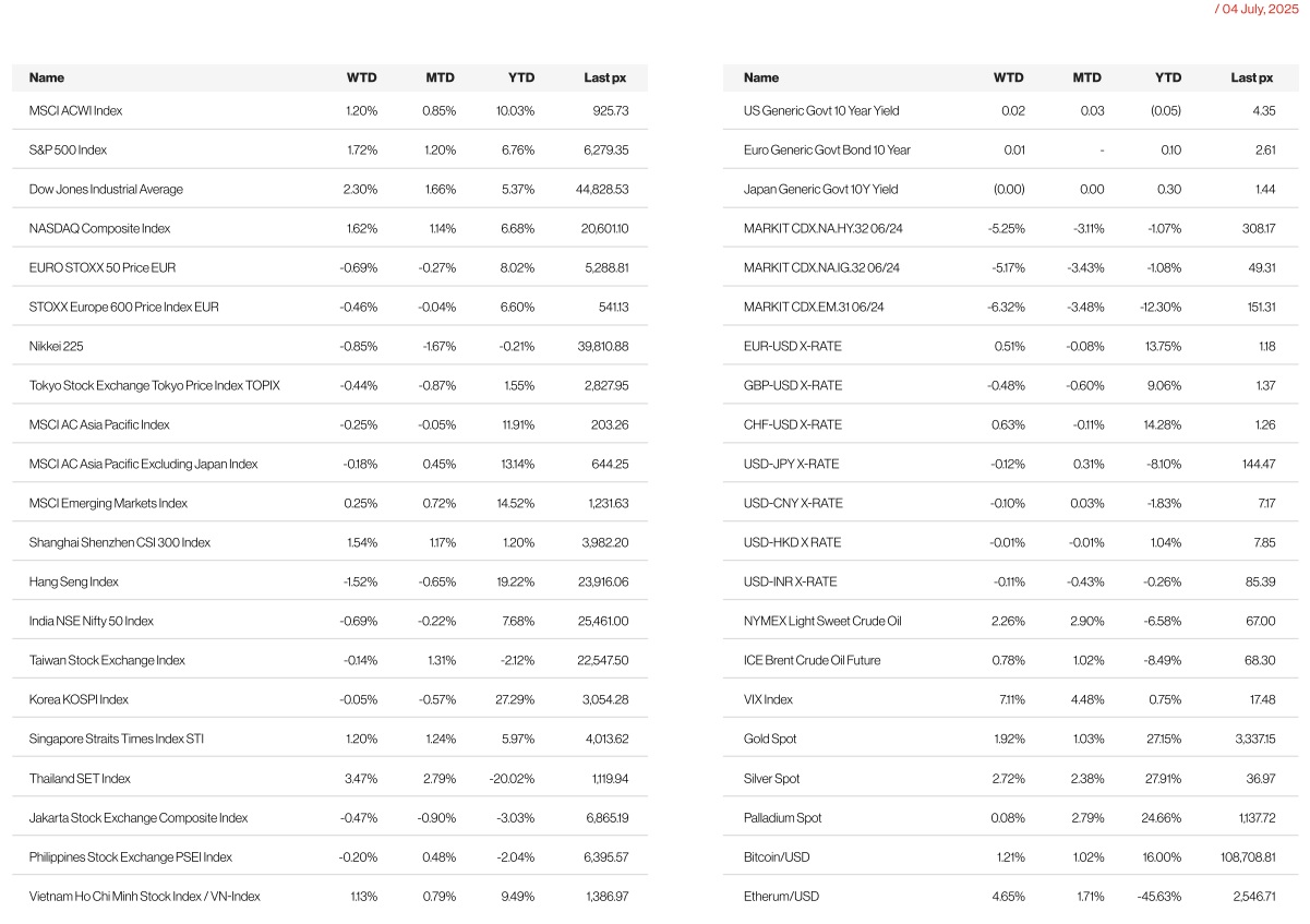 The shortened week saw economic releases that pointed to a resilient economy in spite of Trump’s tariffs. US equity markets finished the week at record levels after a strong non-farm payrolls report underscored a strong momentum in the economy. June Non-farm Payrolls came in at 147k vs 106k est. Unemployment rate edged down to 4.1% vs 4.3% est. This was coupled with June ISM Services at 50.8 vs 50.6 est and ISM Manufacturing at 49.0 vs 48.8 est. May’s Jolts report beat expectations at 7,769k openings, with 1.1 available jobs for every unemployed seeker. Data beats meant that a rate cut in July is no longer on the cards. 10-year UST yields closed higher at 1.345% with the 2’s closing at 3.879%, both higher for the week by 8 bps and 14 bps respectively. Fed Chair Powell pushed back expectations of an immediate rate cut by the FOMC by saying that the Fed expects inflation to rise over the summer, with the OIS market responding by pricing out a July or even a September move. Powell did add that a majority at the Fed expect rate cuts later this year but given the lack of pressure on either side of the dual mandate it may take longer than some had expected for the Fed to eventually cut rates.