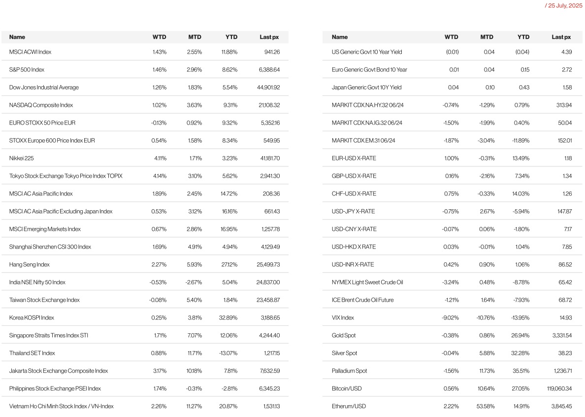 European Currencies rose against USD with EUR (+1% to 1.1742), GBP (+0.16% to 1.3438) and CHF (+0.74% to 0.7954). ECB kept its policy rate unchanged at 2% as expected, with ECB President Lagarde signalling patience on further rate cuts. In addition, continued speculative reports of progress towards a potential US-EU trade agreement last week supported EUR. GBP underperformed on softer-than-expected retail sales data. EURGBP rose 0.82% to close the week at 0.8739, surpassing the high last seen in April, as Eurozone PMI beats with UK PMI softer.