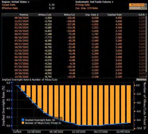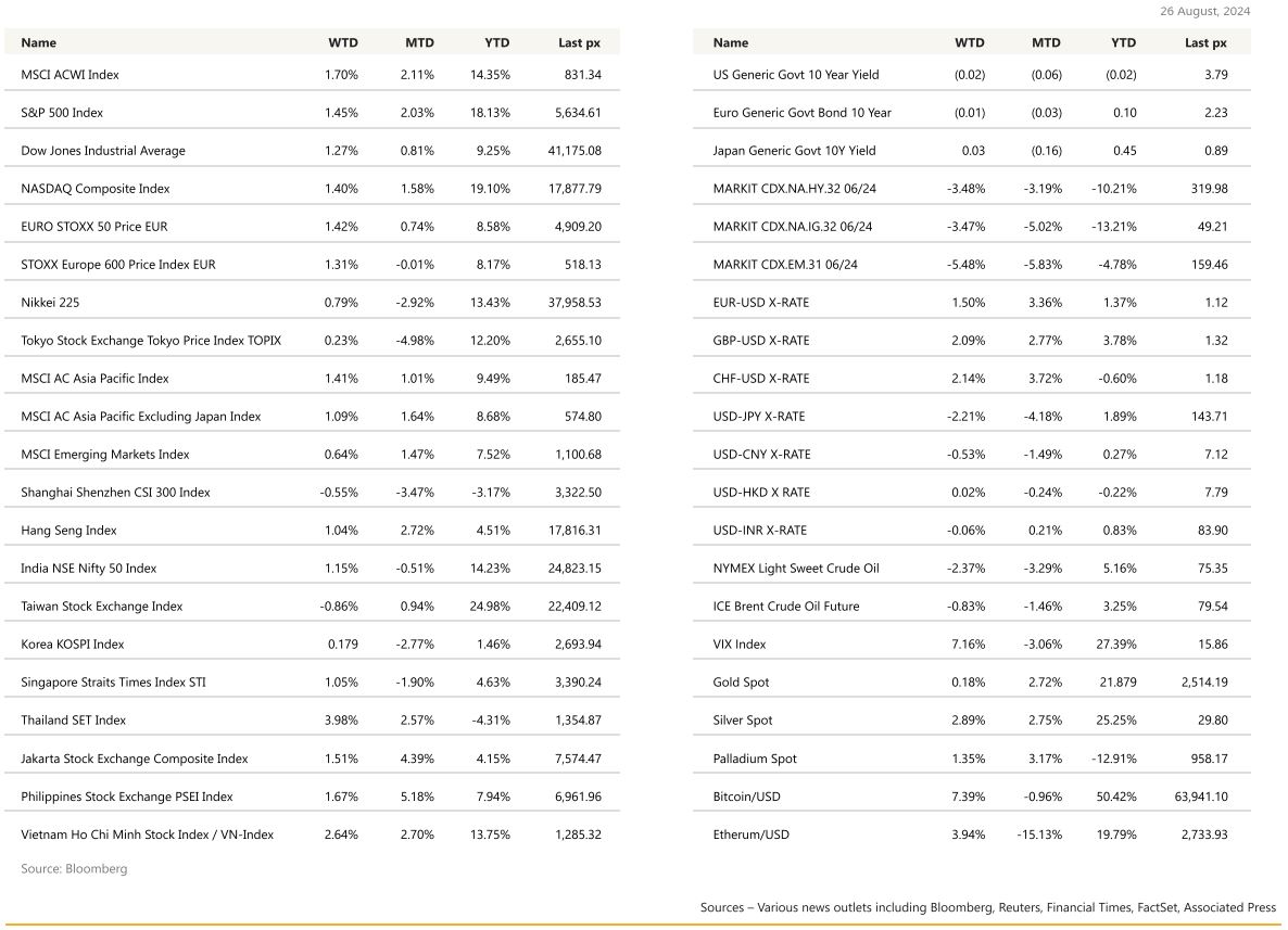 The event everyone was waiting for took place Friday night, when Federal Reserve Chair Jerome Powell’s speech at the Jackson Hole symposium cemented bets that the central bank will start cutting interest rates next month. Powell made clear his intention to prevent further cooling in the labour market and acknowledged recent progress on inflation. US markets rallied with real estate taking the podium as the best finisher up 3.6% for the week. The 3 major indices ended up around 1.5% for the week whist the Russell 2000 rallied 3.6%. Powell reiterated that the “pace of rate cuts will depend on incoming data, the evolving outlook and the balance of risks”. The UST10Y yield fell 5.5 bps to 3.799% whilst the more sensitive 2Y yield fell 9 bps to 3.915%. The dollar weakened across the board. Turning to data releases during the week, initial jobless claims barely rose last week, signalling that the labour market is moderating only gradually. The fourweek moving average, which smooths out some of the volatility, fell to the lowest in a month. Sales of previously owned homes rose in July for the first time in 5 months, suggesting the housing market is poised to stabilise as mortgage rates decline. Futures markets are pricing in a high probability that the central bank’s benchmark rate will be reduced by a full percentage point over the next three meetings: