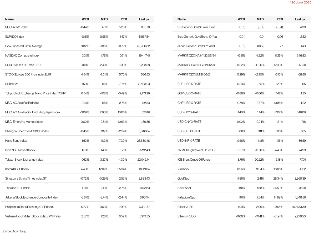 Progress on tariff deals were scarce with no new deals reported. A toplevel meeting between Japan and the US was cancelled, as well as reports of revoked waivers for semiconductor companies dampened sentiment. Friday saw an earlier rally after comments made by Fed Governor Christopher Waller, who said the central bank could lower interest rates as soon as next month. Waller said economic data shows GDP growth and inflation are running close to the Fed’s targets. The Fed which met on Wednesday left rates unchanged as expected, pencilling in 2 rate cuts this year, though new projections showed a growing divide among policymakers over the trajectory for borrowing costs as tariffs make their way through the US economy. There was a hawkish shift as seven officials projected no cuts this year, up from four in March. Beyond, fed funds projections moved 25 bps higher in 2026 and 2027, motivated by a stickier inflation profile. Chair Powell’s press conference did not take the opportunity to reinforce the potential nearterm dovish signal from the dot plot. Instead, Powell indicated that the labor market and economy remain solid and that they continue to anticipate inflation will rise due to tariffs. He also emphasized that uncertainty remains historically elevated, a reason to downplay rate projections, and that all of the fed fund’s paths in the Summary of Economic Projections could be reasonable. The dispersion of the 2025 dots indicates, there is clearly no strong consensus at this point. They retained the language that “labor market conditions remain solid” and “inflation remains somewhat elevated.” The Committee noted that “uncertainty about the economic outlook has diminished but remains elevated.” Similarly, they also removed the statement that the risks of higher unemployment and inflation have risen. This is likely a function of a clearer direction of travel with respect to the Trump administration’s tariff policy as well as more clarity around the contours of the reconciliation bill working its way through Congress.