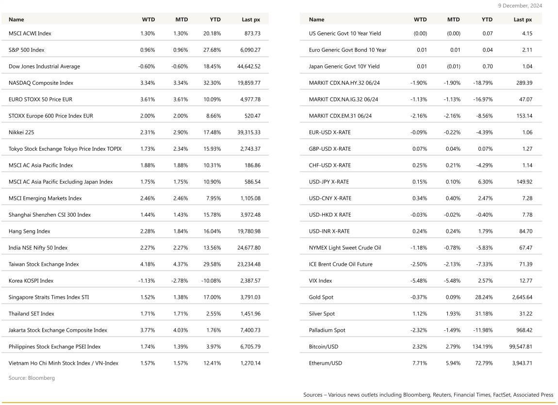 Korea’s political fiasco left the index lower by 1.13%. South Korean lawmakers on Wednesday called for the impeachment of President Yoon Suk Yeol after he declared martial law only to reverse the move hours later, triggering the biggest political crisis in decades in Asia s fourth-largest economy. South Korea s finance ministry said it was prepared to deploy unlimited liquidity into financial markets if needed, with the Yonhap news agency saying the financial regulator was ready to deploy 10 trillion won ($7.07 billion) in a stock market stabilisation fund.
