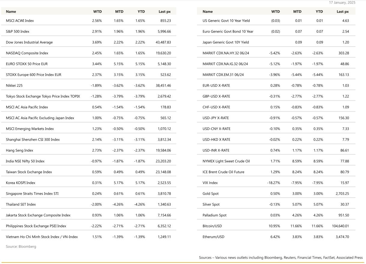 December retail sales missed estimates month-over-month while weekly jobless claims rose more than expected — two signs of economic cooling that may ease concern about the Federal Reserve’s interest-rate path. The softer inflation numbers are likely insufficient to place a January cut on the table but it does strengthen the case that the Fed’s cutting cycle has not yet run its course. The UST10Y yield retreated to 4.627% and the 2’s closed at 4.282% after hitting a high of 4.81% and 4.42% respectively. The VIX also retreated to close at 15.97. In other releases, the Fed’s Beige Book report noted that economic activity increased ‘slightly to moderately in late Nov/December’ whilst the Empire State Manufacturing Index fell to -12.6 (exp. 3.0). Meanwhile, a report late on Friday said that Trump and Chinese President Xi Jinping spoke by telephone, may have soothed some anxiety about trade tensions.