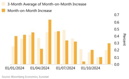 In the Eurozone, annual inflation was confirmed at 2.4% for December 2024, up from 2.2% in November, while core inflation remained steady at 2.7%, indicating persistent underlying price pressures. Services were the main driver of inflation, contributing about 1.8% to the headline figure. Energy costs rose by 0.1% in December, reversing the -2% decline in November, marking the first positive change since July. Services inflation in the euro area increased to 4% year-on-year in December, up from 3.9% in November, remaining stuck around this level since May. However, the three-month-on-three-month seasonally adjusted annualized change in services prices fell to 1.9% from 2%.