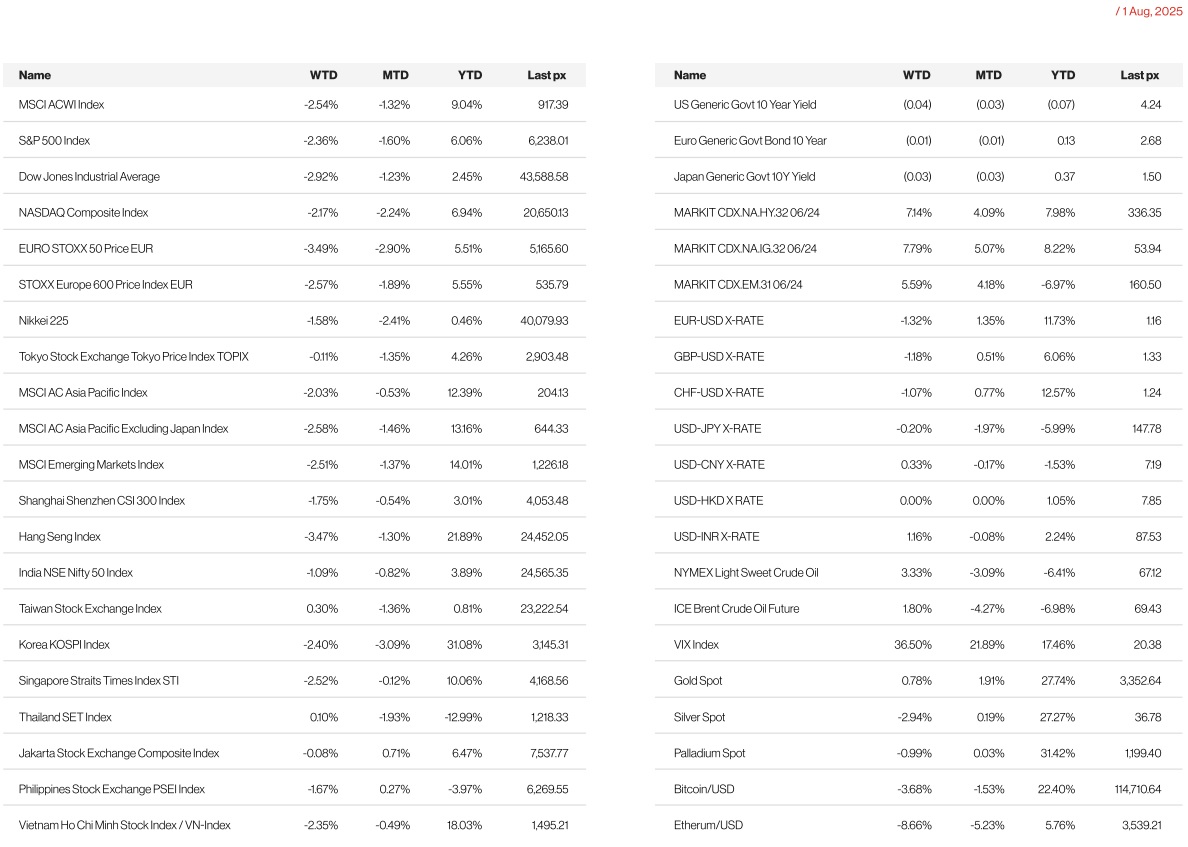 Non-farm payrolls increased 73k against expectations of 104k and the unemployment rate rose to 4.2% from 4.1%. The agency also revised down employment growth in May and June, reporting 250,000 fewer jobs than previously thought. In the last three months, employment growth has averaged a paltry 35,000 which has been the worst since the pandemic. The shocking reveal that US job growth cooled sharply over the past three months sparked a rally in Treasuries in contrast to declines earlier in the week stemming from a hawkish Fed tilt post FOMC on Thursday. Further drama unfolded, undercutting market confidence when President Trump directed officials to fire McEntarfer, the commissioner of the BLS accusing her of rigging jobs figures to make the Republicans, and him, look bad! Separately, a member of the Fed’s rate-setting committee, Adriana Kugler, is resigning early giving Trump an opportunity to install someone new. The latest tariff measures announced although less extreme than what Trump first put forward in April, will still push the average tariff rate to roughly 17%, up from less than 2.5% at the start of the year. For a comprehensive list of tariffs imposed, please refer to https:// www.whitehouse.gov/presidential-actions/2025/07/further-modifyingthe-reciprocal-tariff-rates/